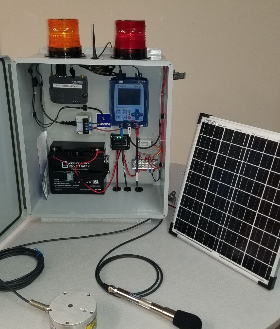- Vibration monitor base unit with geophone. Including enclosure for unit, battery backup, strobe lights for the warning and alarm levels, and solar panel.
